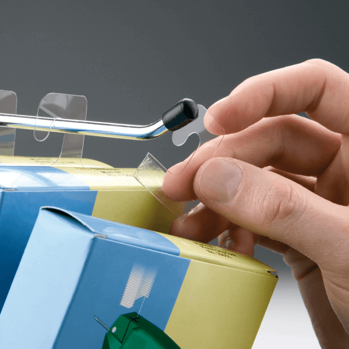 Hang tabs, which are also knows as euro tabs, are great for merchandising small products from your single prong merchandising hooks. They are also great for use as a replacement hook if one on a product has torn, allowing you to re-hang it.