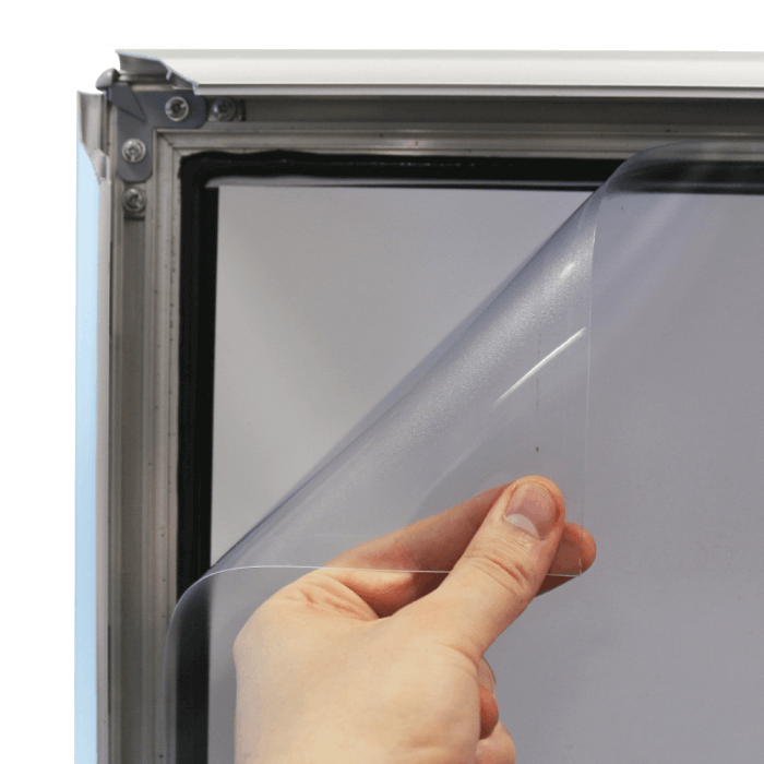 The sign has a snap frame mechanism which clamps down the edges of your posters and holds the protective cover in place. To update, simply unclip the snap frame, switch the poster, replace the plastic cover and snap the frame shut again.