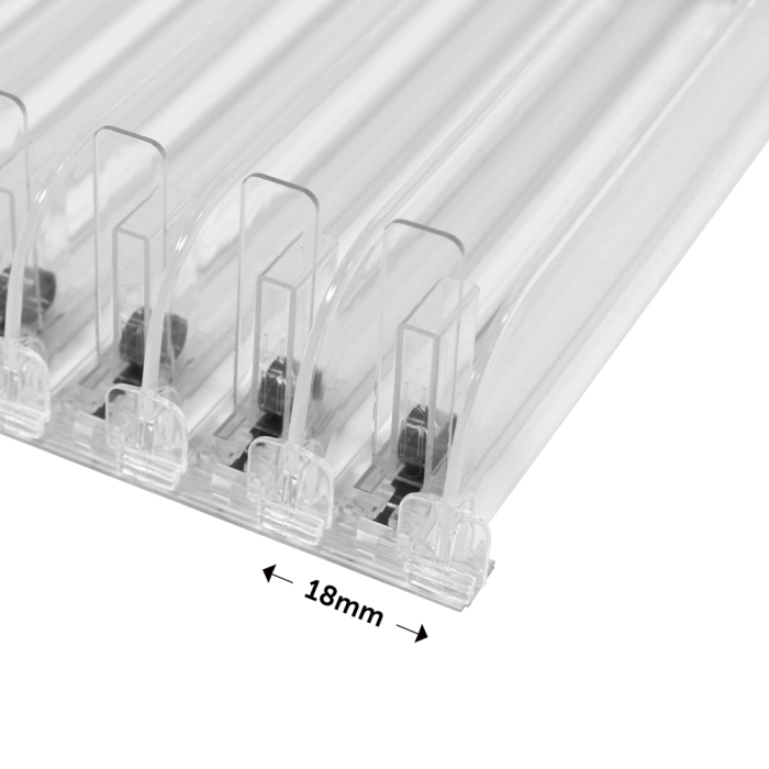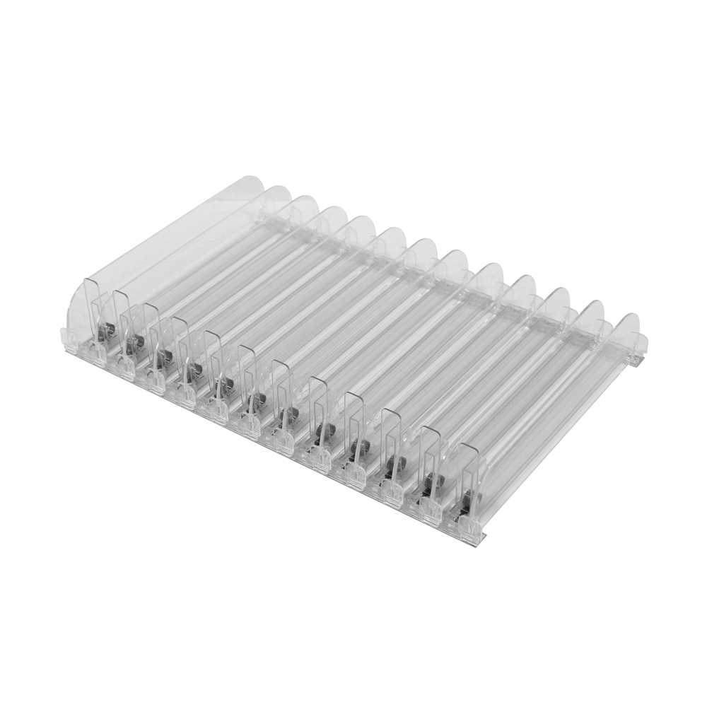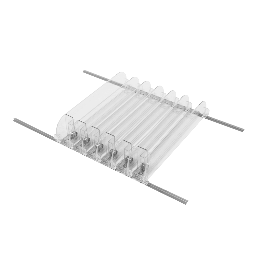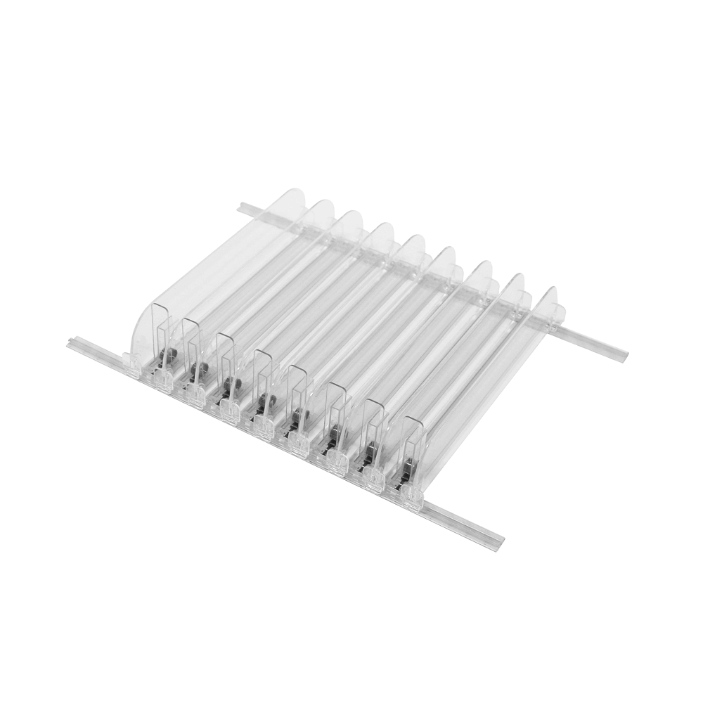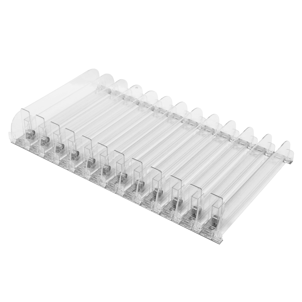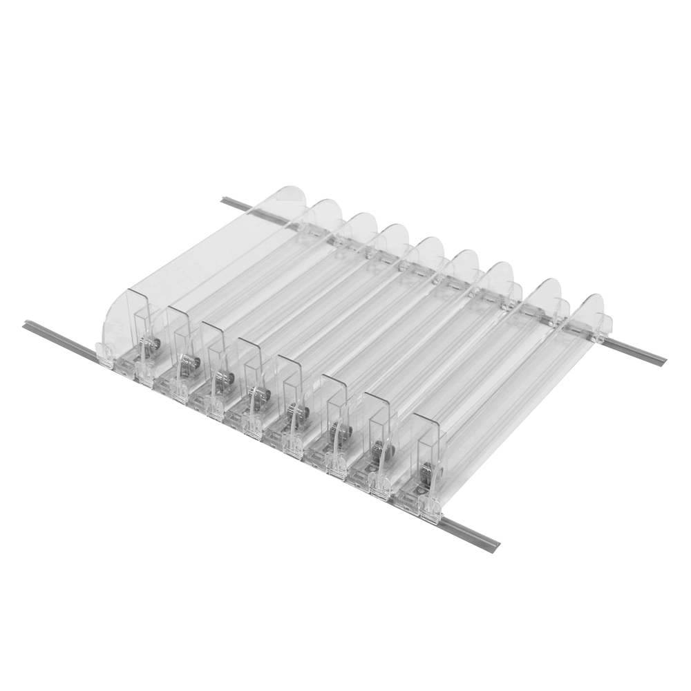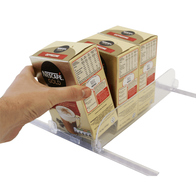 Stock pusher systems offer you an automatic way to keep your products at the front of your shelves at all times. The kits come with either six, eight or twelve rows, each of which has the option to add a push feed locking mechanism. These spring loaded product pushers are compatible with shelves that have a depth of at least 28cm, as well as our popular Free Standing Display Units.