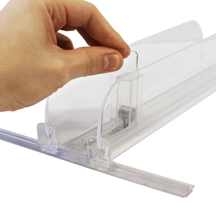 Please be aware that some lightweight products that are much taller than the height of the push feed could be prone to falling over the front rail. If you are looking to display wider products, you can place additional push feed and guide rails between dividers to keep them in place.