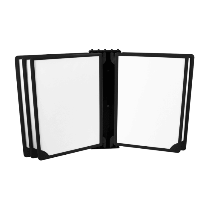 Each display book has five plastic poster frames, with double-sided PVC covers to protect your insert. These wall mounted poster holders save you vital floor space within your premises compared to free standing poster holders, and provide a more interactive shopping experience for your customers. The black A4 size has black plastic pivots on the spine, whereas the A3 size has clear plastic pivots.