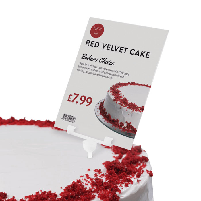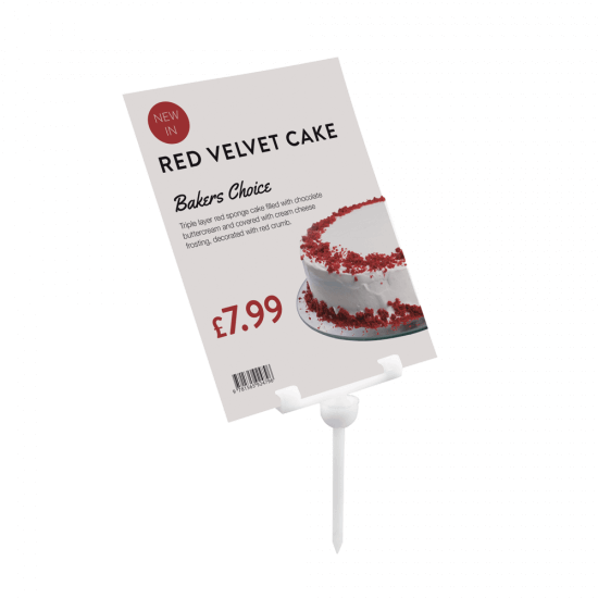 The spike style ticket holders simply stick directly into your product, such as food, foam or yarn. Your price labels and information tickets are held in place by the clip, which features a pivot joint that allows you to tilt, rotate and swivel your card or ticket to any angle for optimal visibility.