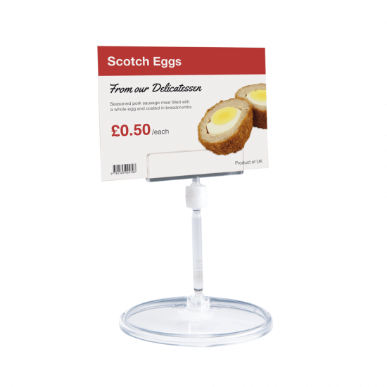 The round plastic base has a diameter of 90mm while the card holder width measures 55mm. The clear plastic card holder can be adjusted using the ball-and-socket joint that it sits on, so that your displays are perfectly angled for your retail environment. The ticket holder comes with a 50mm tall clear plastic rod.
