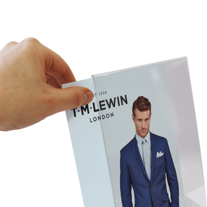 This table sign holder has a back panel which pulls away enough for you to insert your new graphics in and out via the side opening. This is an incredibly quick and easy way to change a poster - ideal for businesses who are frequently updating their offers.