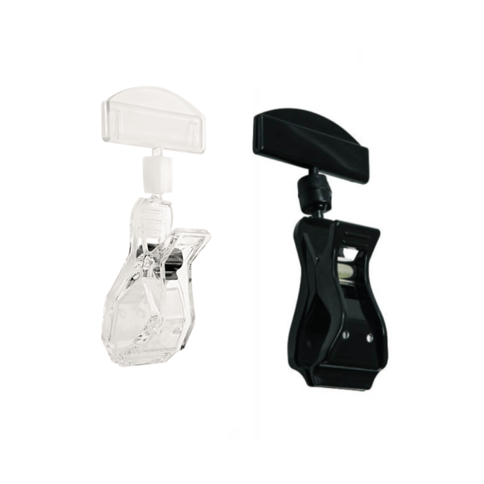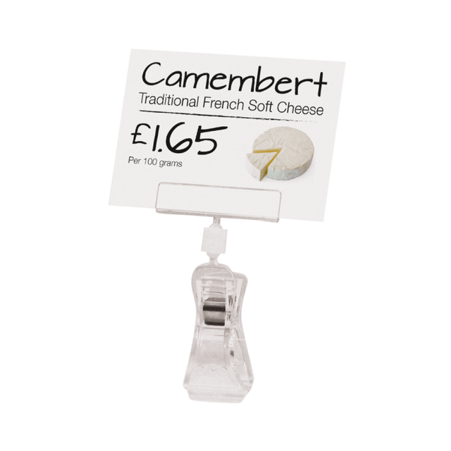 Position your labels at almost any angle to allow easier viewing for passing customers with this Slide In Card Holder Clip. The plastic ticket holder's card slot sits on top of a ball-and-socket joint, which allows the holder to tilt and rotate. It features a spring clamp that can attach to panels or tubes up to 25mm thick and features a card slot to hold price tickets printed on card.