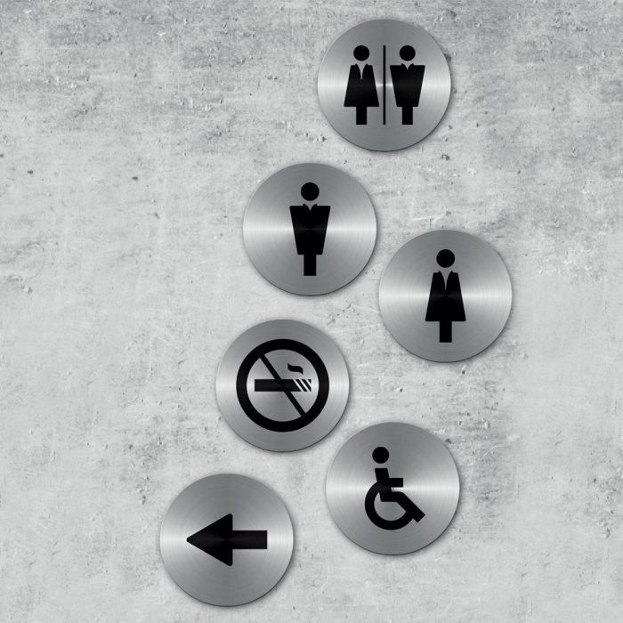 Our Stainless Steel Sign Multipack includes six circular designs. These brushed stainless steel signs look great and are clear and intuitive to understand. The pack includes a no smoking sign, an arrow and four toilet door signs for unisex toilets, disabled toilets and ladies' and gents' toilets.