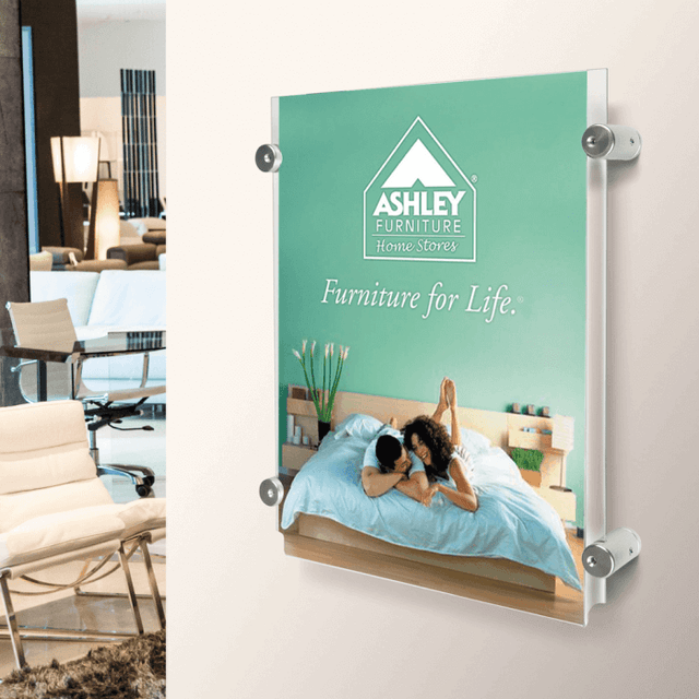 The clear panels have been manufactured from clear 2mm thick Supervue acrylic and are supplied with four satin anodised stand offs. The only exception is the A0 panel, which is manufactured using 3mm PETG and comes with 6 standoffs. The stand-off panel wall mount fixings have a modern and professional appearance. It is easy to change your posters whenever required.